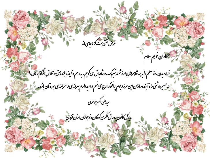 همچنین سید علی اکبر موسوی مدیرکل کانون استان قزوین با ارسال پیامی ،روز معلم را به همه همکاران خود تبریک گفت.